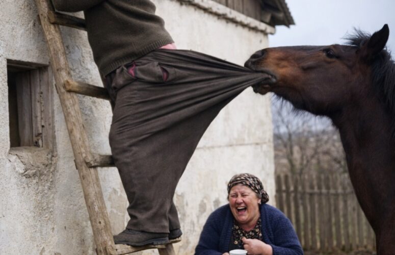 Старик поднялся по лестнице, чтобы убрать с крыши сухие ветки, но в этот самый момент конь вдруг ухватил зубами край его штанов и резко потянул вниз