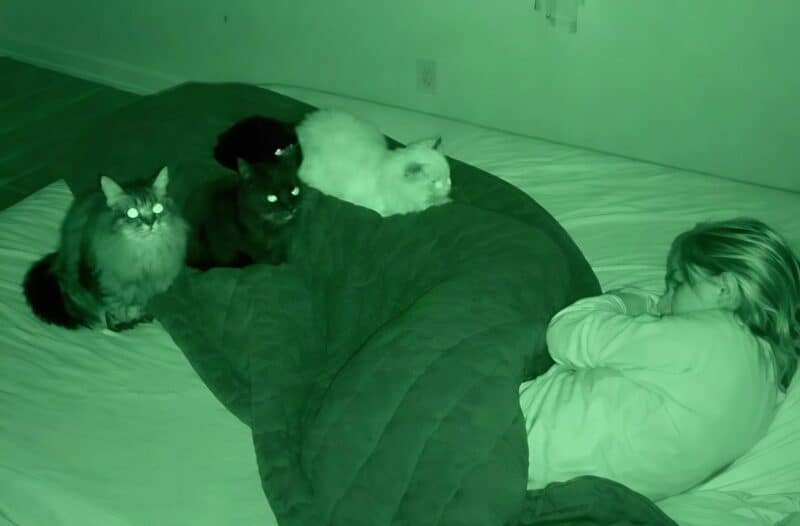 Утром я пересмотрела запись и сначала ничего необычного не увидела. Я просто спала, коты заходили в комнату и сидели рядом.