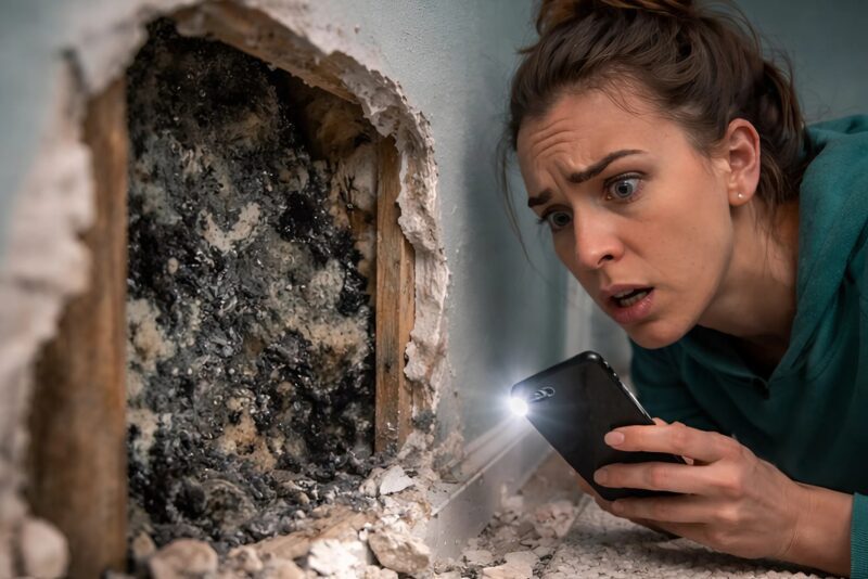 Все пространство за кроваткой моей дочери было покрыто густыми черными пятнами. Это была не просто грязь и не обычная сырость. На дереве и изоляции рос толстый пушистый слой черной плесени. Я сразу поняла, что что-то здесь очень не так.
