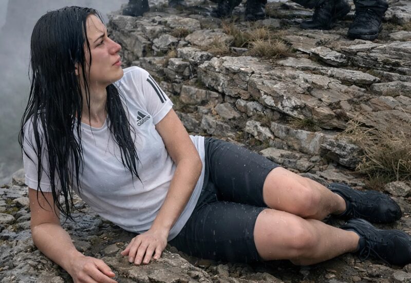 Падение было жёстким, она ударилась о скалу и потеряла сознание, но не разбилась. Её удержал трос, закреплённый заранее с противоположной стороны уступа.