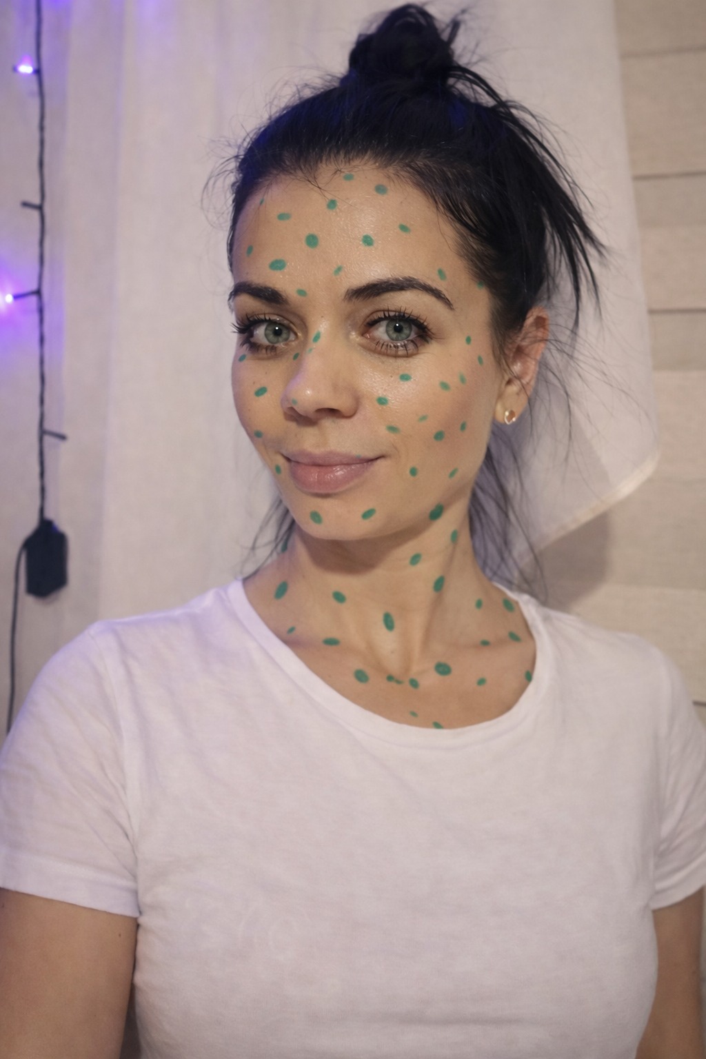 Через десять минут я выглядела так, будто меня разрисовал ребёнок. Зелёные точки были на лице, шее и руках. Я надела старую домашнюю одежду, растрепала волосы и начала репетировать уставший голос.