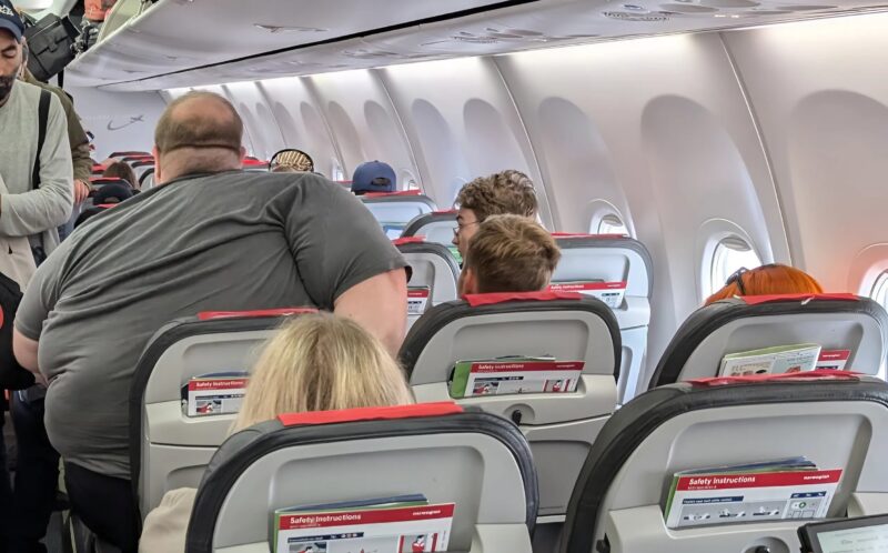 Самолёт почти полностью заполнился пассажирами. Люди суетились, раскладывали вещи в багажных отсеках, искали свои места. Мужчина в серой футболке занял своё кресло у прохода, и сразу стало ясно: места ему явно не хватало.