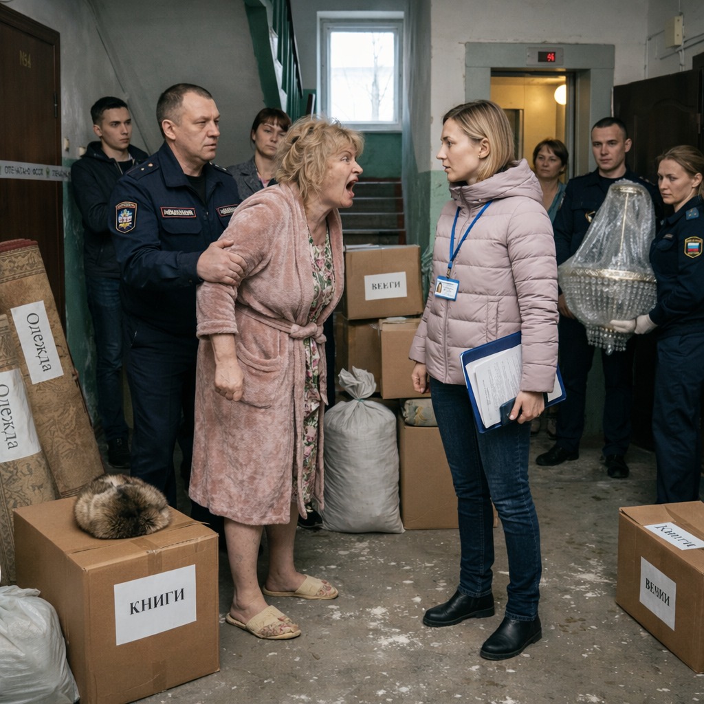 Она обвела взглядом тамбур. Соседи. Приставы, которые уже начали выносить её итальянский комод. Груды узлов. И я — в своем пуховике, со служебным пропуском на шее.
