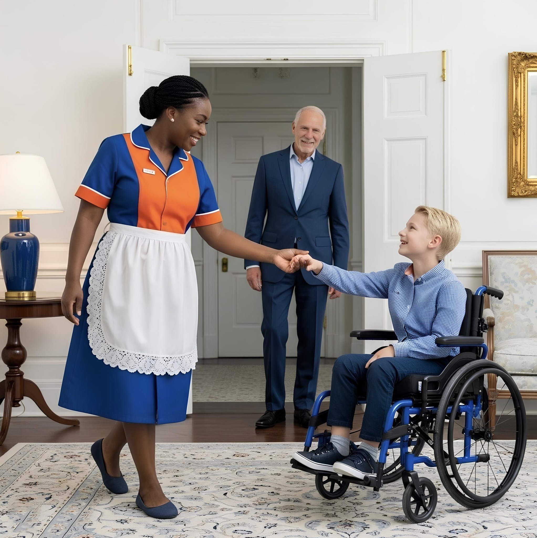 Покоївка, не звертаючи уваги на пильні погляди, тримала тендітну руку молодого чоловіка в інвалідному візку та ніжно оберталася по колу, погойдуючи мелодію, яку могло чути лише серце. Потім двері скрипнули — і господар будинку повернувся.