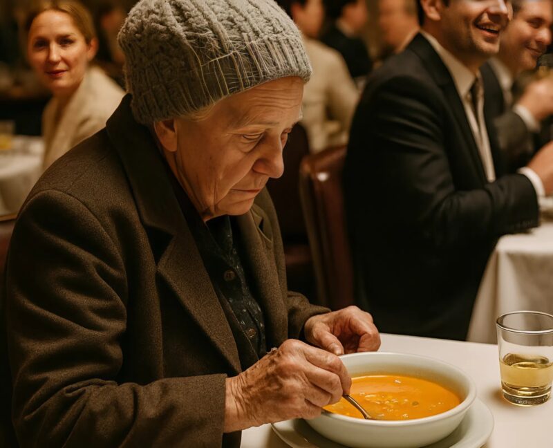 Услышав этот разговор, несколько мужчин за соседним столиком начали громко смеяться. За ними подхватили другие — кто-то шептал с насмешкой, кто-то криво улыбался. Словно по залу прошёл лёгкий смешок презрения. “Пришла нищенка, чтобы поесть супа среди богатых”, — шептали.